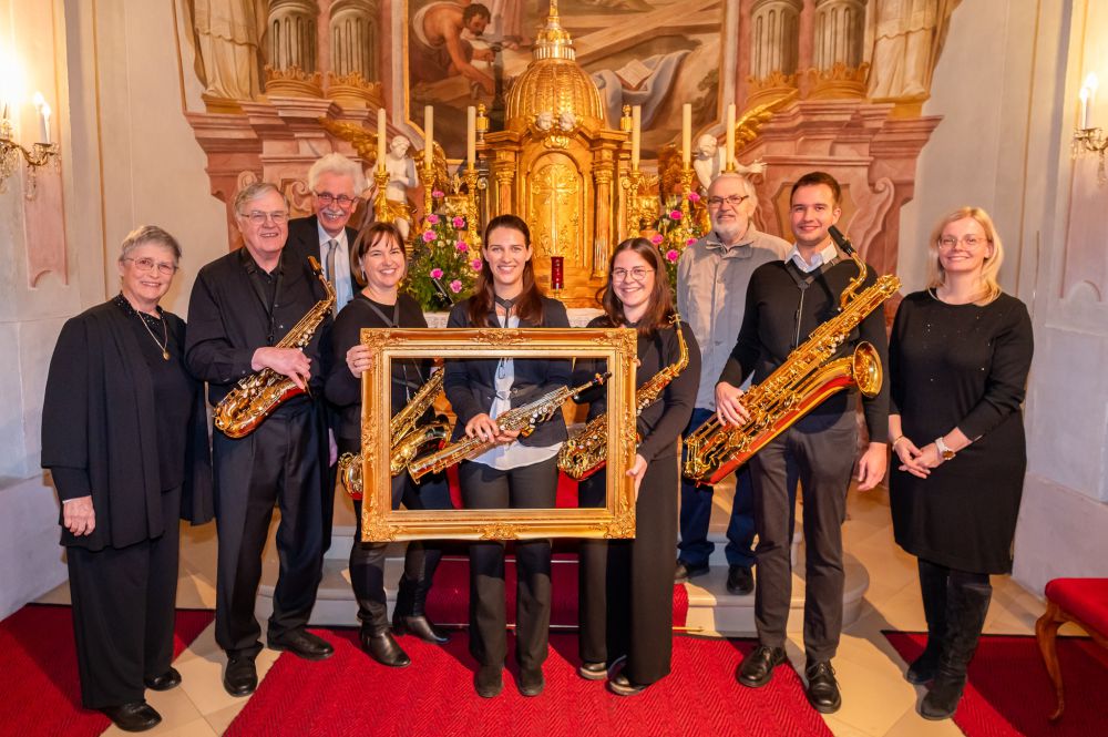 v.l.n.r: Monika Schüller (Orgel, Klavier), Werner Schüller (Saxophon), Egon Fischer (Moderation), Cornelia Högl-Egretzberger (Saxophon), Denise Berger (Saxophon), Rebecca Rucziczka (Saxophon), Leopold Resch, Jakob Pollerus (Orgel, Klavier, Saxophon) und Anne-Kristin Fischer (Gesang, Klavier)